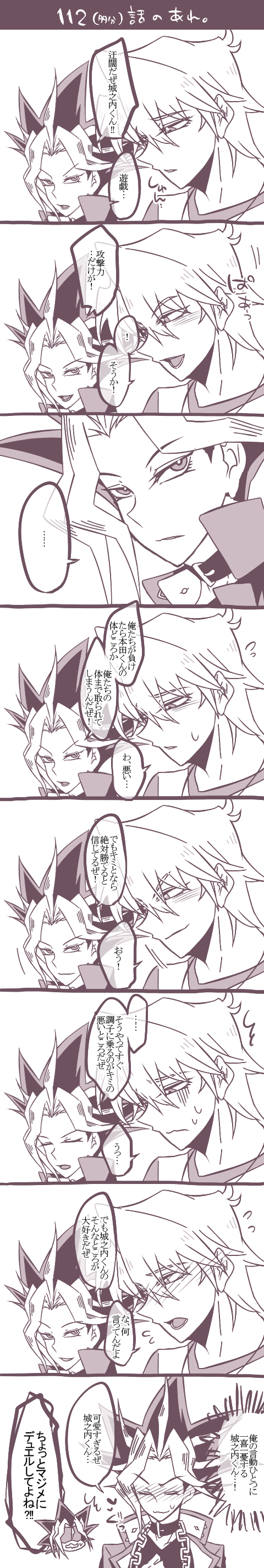 王城ちゃん好きっていうのも勿論なんですけど、王様のこと全力で信じてるし調子にも乗るしご機嫌伺ってみたりする城之内くんかわいすぎだし、こううまく飴鞭で親友を操縦してる王様も好きですまあようするに王城が好きです