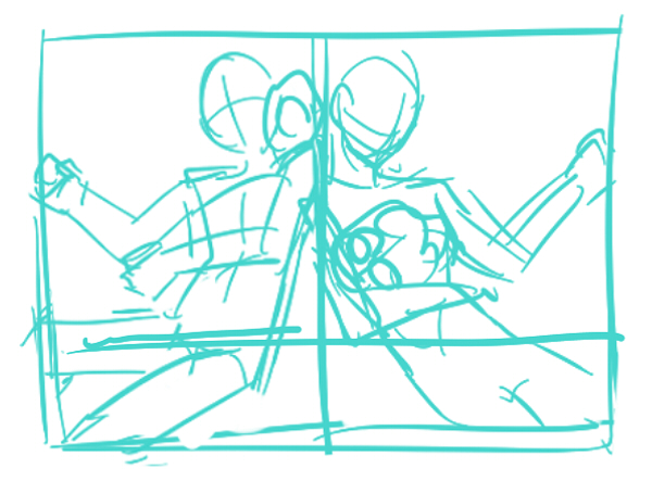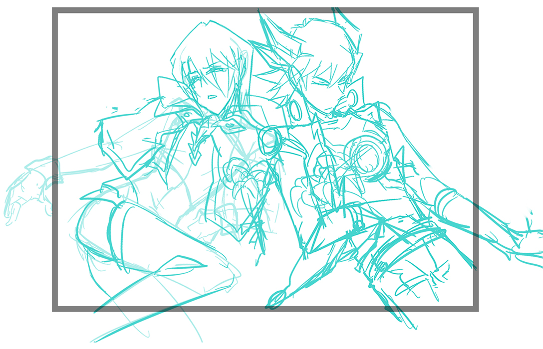 2.メモを元に適当にラフをこねこねします。適当にとか言ってるけどここで完成度と至るまでのモチベーションが決まるのでおおこわいこわい…しかもこのラフにいたるまでに3回没にしました。全部鬼柳ちゃんが足ひっぱりました。許さない。